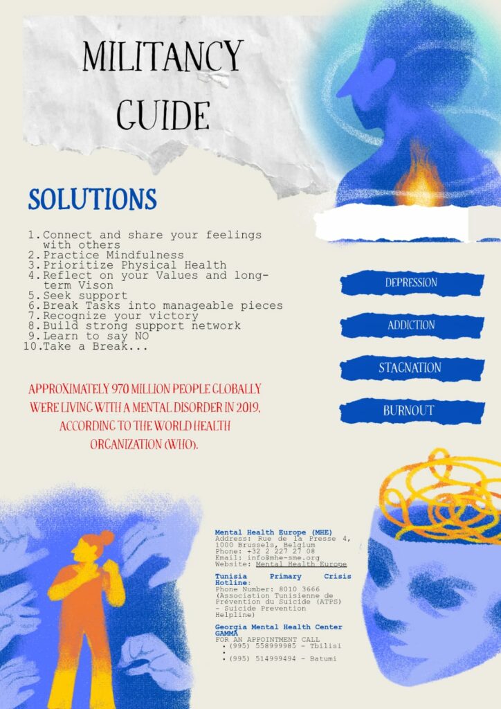 While the aim was to encourage young people to question their worldviews by offering an opportunity for intercultural exchange, this meeting also sought to co-create tools by young people for young people. The participants wrote a song on the theme of mental health, drew a poster and designed a poster to raise awareness among young people about mental health, created two GCE animations, and wrote and filmed a video on one of the European Union’s objectives.